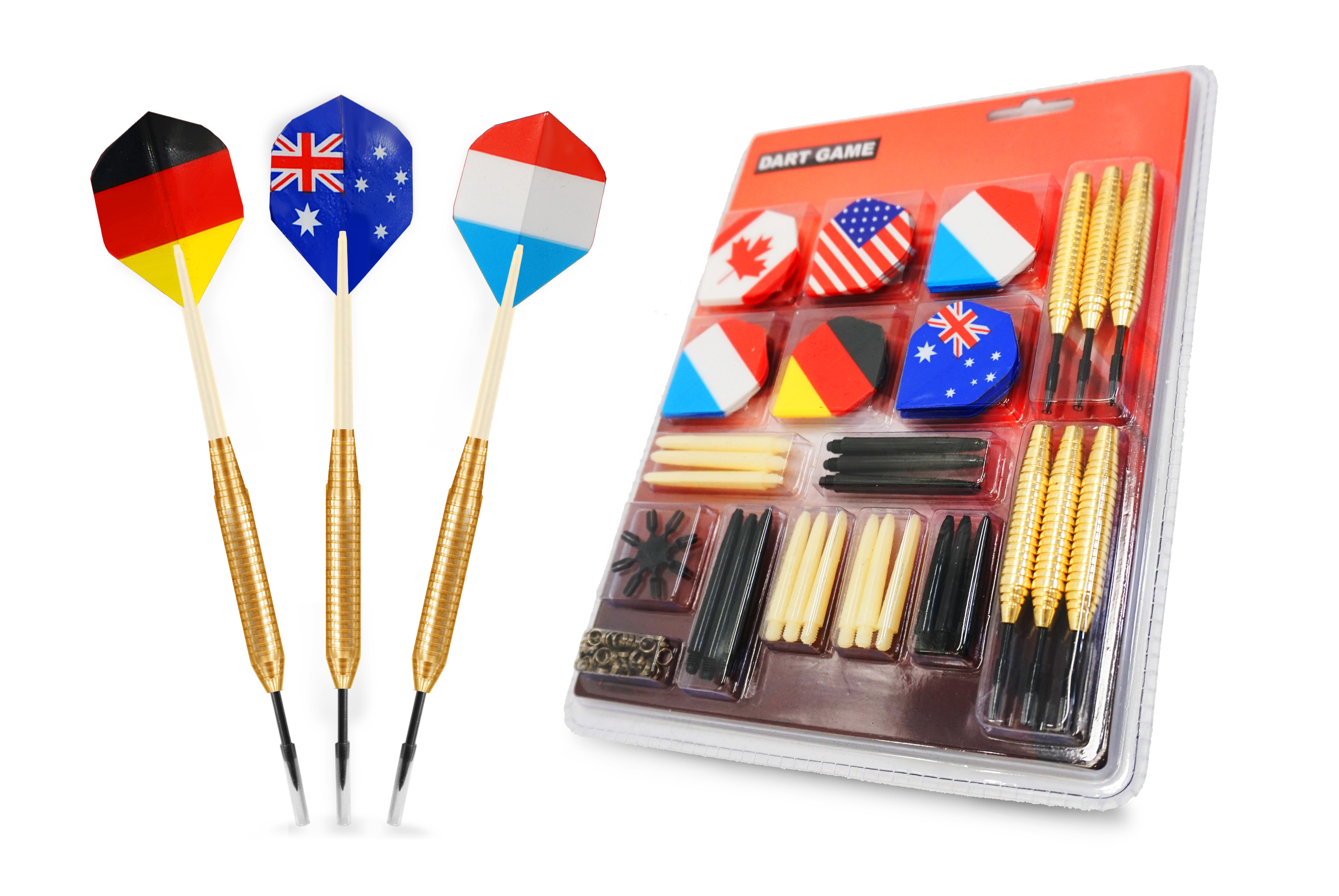 Комплект состоит из 6 баррелей, 18 хвостовиков, 18 оперений, 8 протекторов. Разборная конструкция дротиков позволяет заменить каждую из его составных частей по мере изнашивания оборудования.