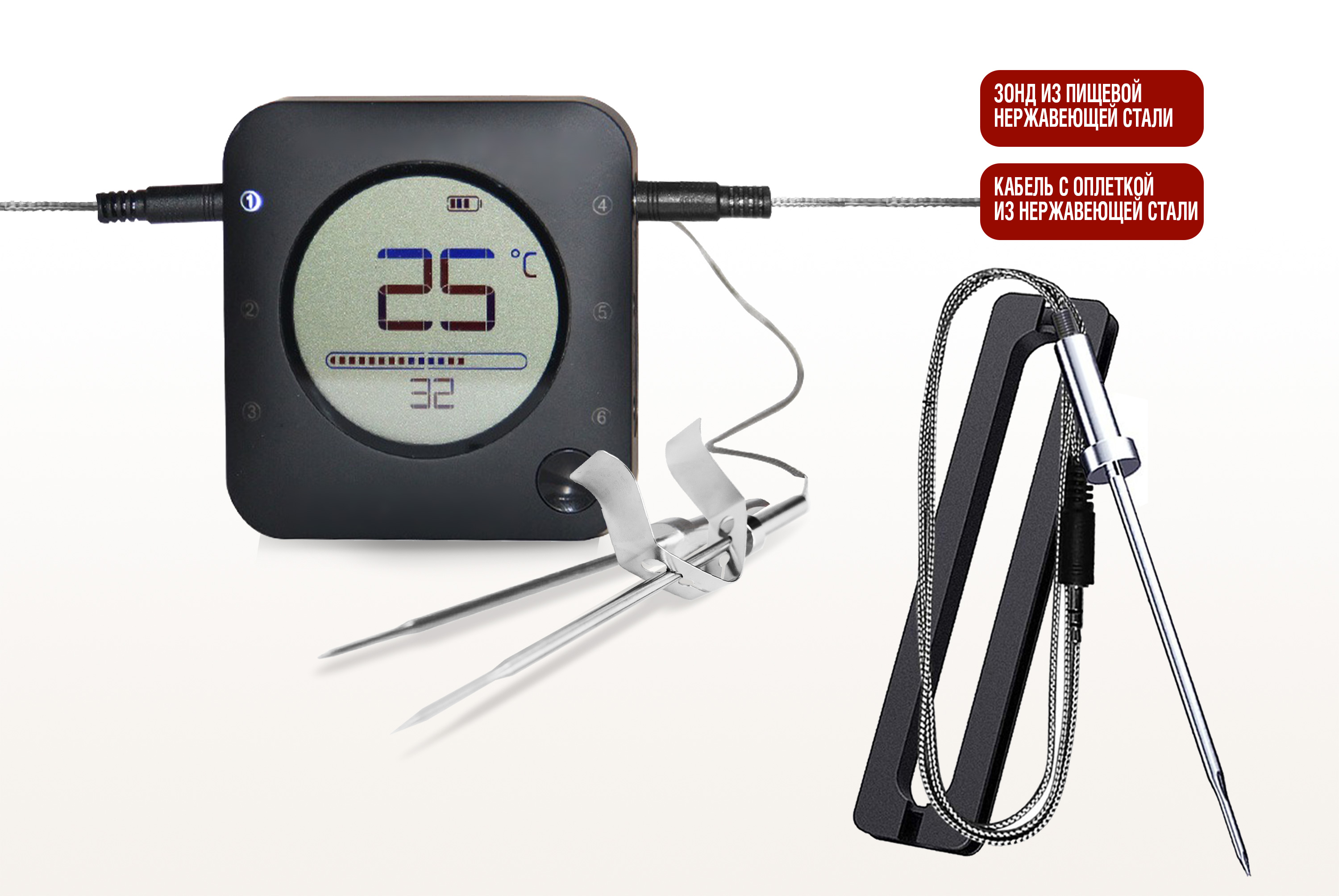 Интеллектуальный цифровой термометр Model 3 с Bluetooth сочетает удобство беспроводного контроля и профессиональную точность измерения.Model 3 поддерживает 6 каналов подключения для одновременного мониторинга до 6 зондов. В комплекте с термометром идет 2 тонких термозонда из нержавеющей стали для легкого погружения в мясо, рыбу, выпечку и другие продукты.