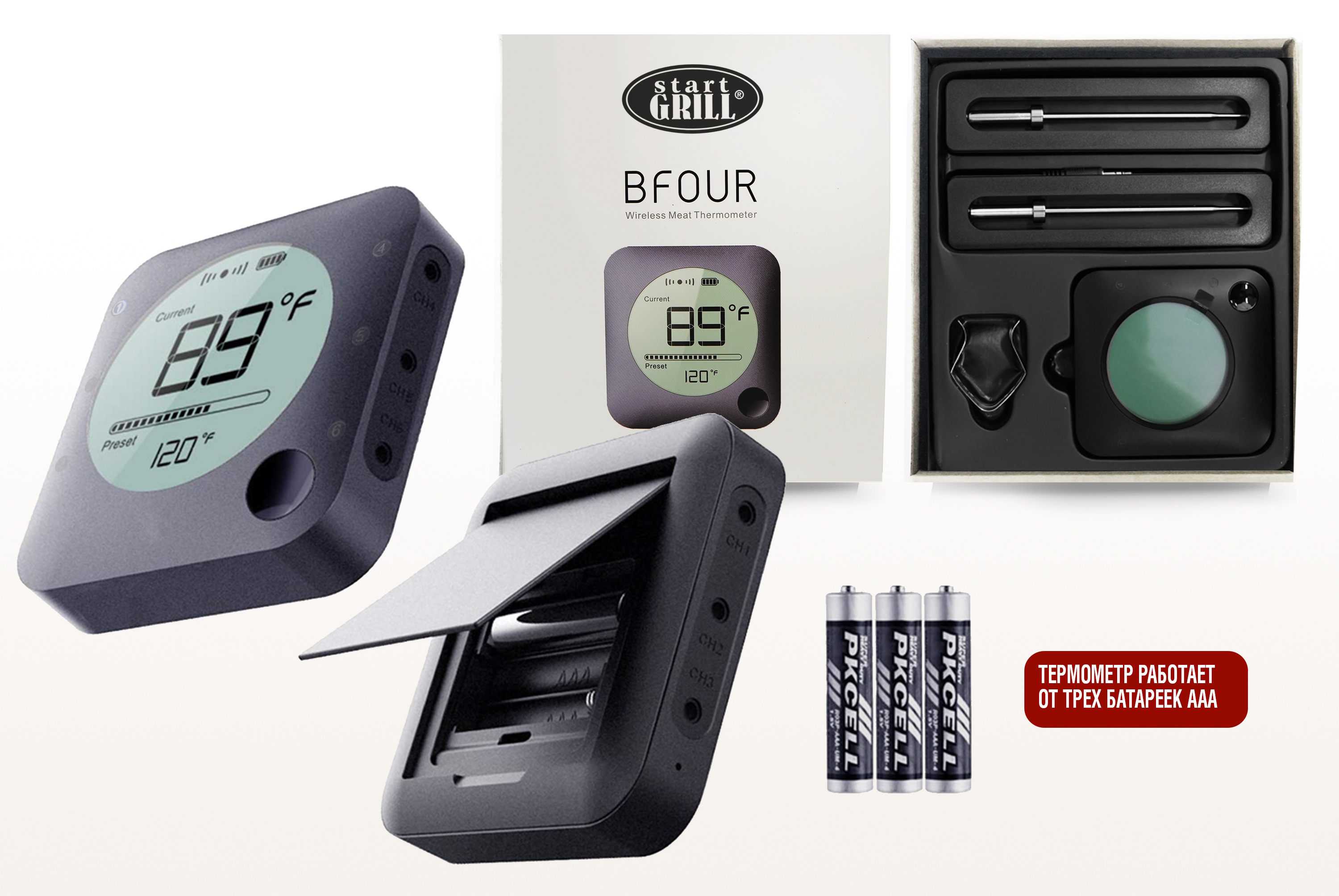 Термометр работает от трех батареек формата AAA (не входят в комплект).