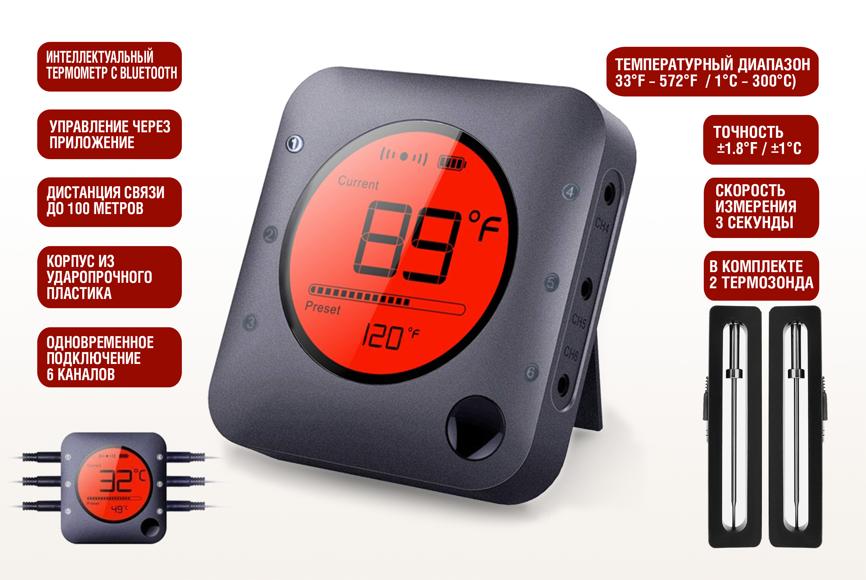 Управление через мобильное приложение по Bluetooth 5.0 включает функции переключения между °C/°F, настройки оповещений о достижении заданной температуры, одновременного мониторинга до 6 зондов.