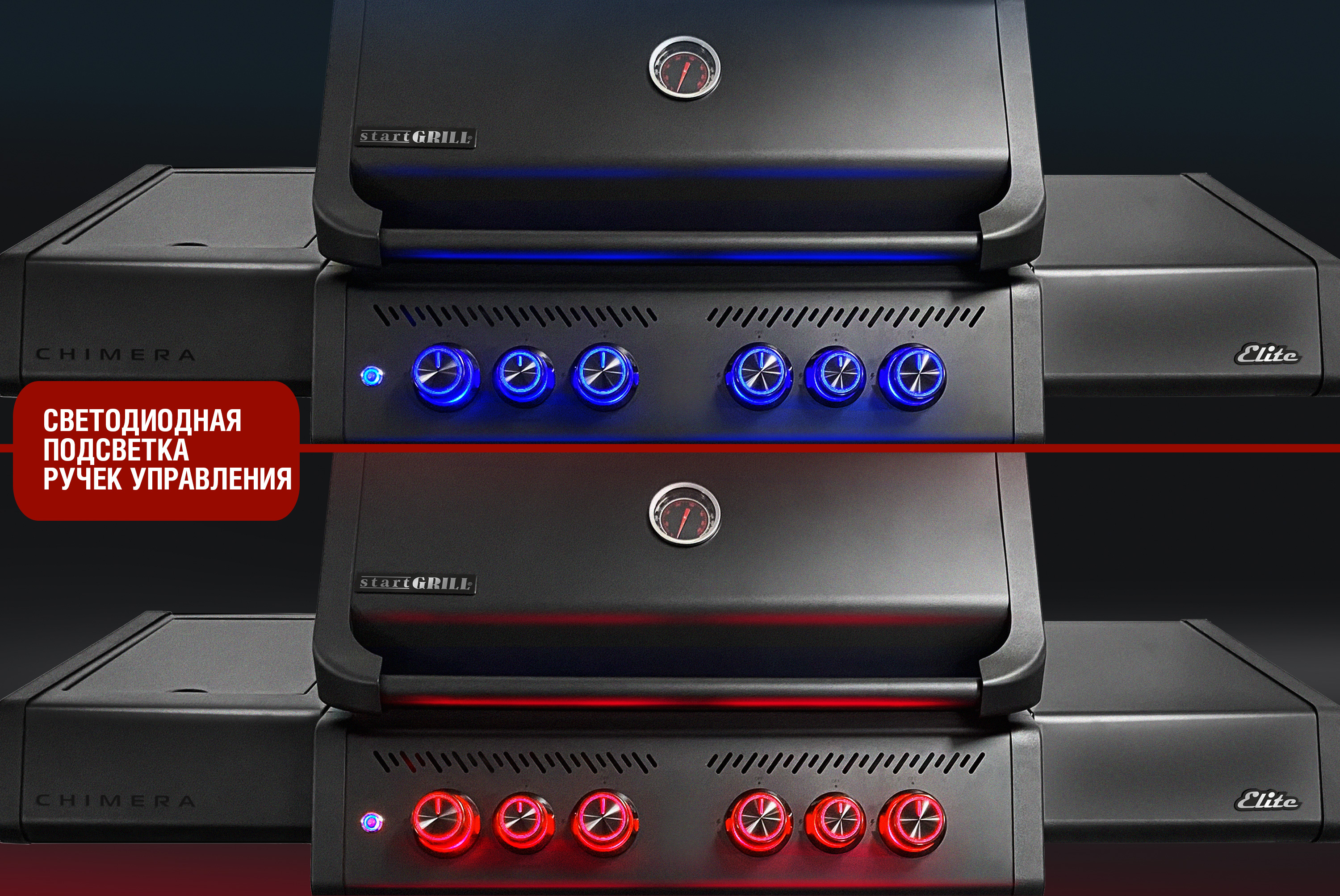 Chimera Elite 500 также оснащен подсветкой ручек, которая может быть отключена по желанию. Красный цвет указывает на то, что включена одна из горелок, неоновая синяя подсветка загорается при отключении гриля.