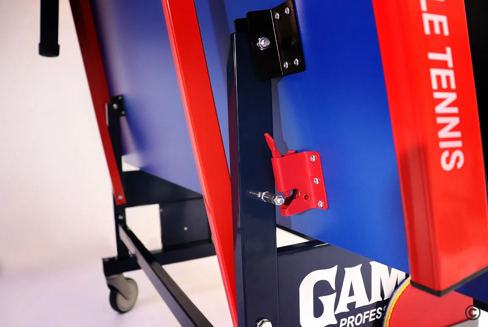 Она предусматривает механизм, позволяющий быстро и надежно закрепить положение стола как в разложенном, так и в сложенном виде. Все манипуляции производятся с рабочего места игрока для каждой из столешниц..